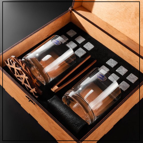 • 1. Качественная деревянная подарочная упаковка  25 на 24 см на 11 см в светлом дереве (есть вариант в темном дереве можете выбрать справа возле цены вариант). Внутренняя часть - это мягкий бархатный ложемент (камни и бокалы всегда будут целые и красиво, престижно хранится) в котором лежат оригинальные камни для виски 12 шт, мешочек для камней из экокожи, бокал на выбор, щипцы и 2 подставки под бокалы.